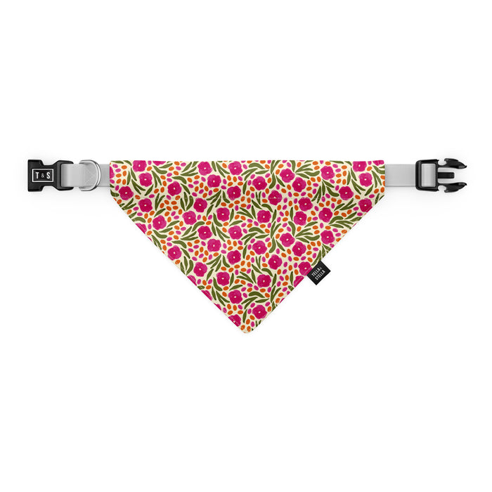 Flancher pour notre design à la ravissante tapisserie florale pour votre compagnon qui mérite ce qu’il y a de plus raffiné! Fabriqué avec des matériaux de qualité, ce foulard est à la fois doux et résistant. Ingénieux et pratique, il s'insère facilement dans le collier de votre animal, sans noeuds ni attaches compliquées.