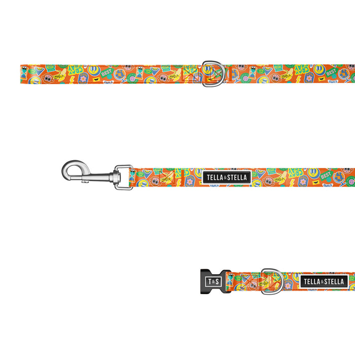 Un fond orange vibrant s'anime avec un assemblage d'autocollants funky, apportant une explosion de couleurs et de motifs éclatants à ton compagnon à quatre pattes. Un collier et une laisse de qualité faits en silicone, résistants, facile d’entretien, sécuritaires et parfaits pour vos balades avec votre chien.
