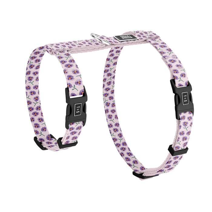 A soft design adorned with small purple flowers, ideal for equally soft companions. A harness made of quality materials, resistant and safe for your cat.
