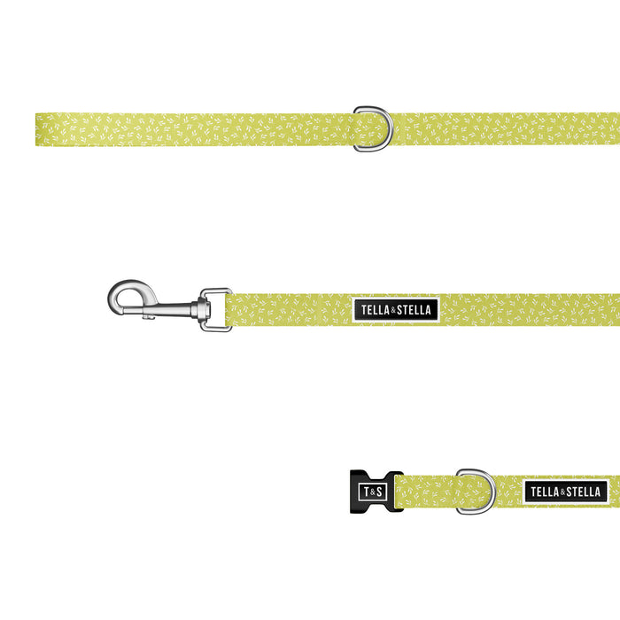 Bring a touch of freshness and lightness to your walks with this charming design of small white leaves dancing on a chartreuse green background. A collar and leash made from recycled water bottles and quality materials that provide strength and safety for your dog.
