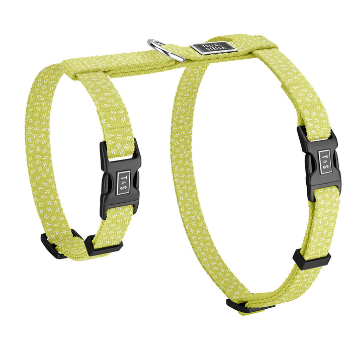 Bring a touch of freshness and lightness to your walks with this charming design of small white leaves dancing on a chartreuse green background. A harness made of quality materials, resistant and safe for your cat.
